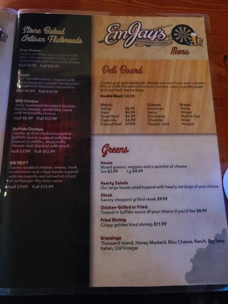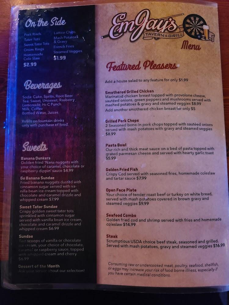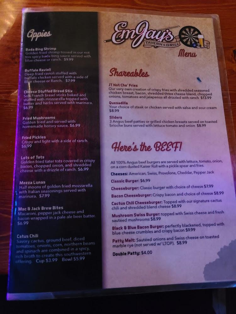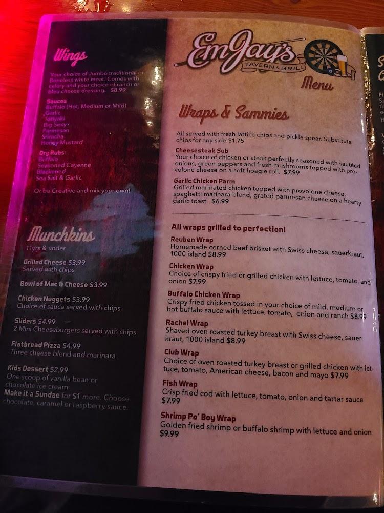 EmJay's menu features diverse options to satisfy various palates. Appetizers like fried mushrooms and lots o’ tots set the tone for a fulfilling meal. Their homemade hand-rolled eggrolls, especially the buffalo variant, impress diners of all ages.